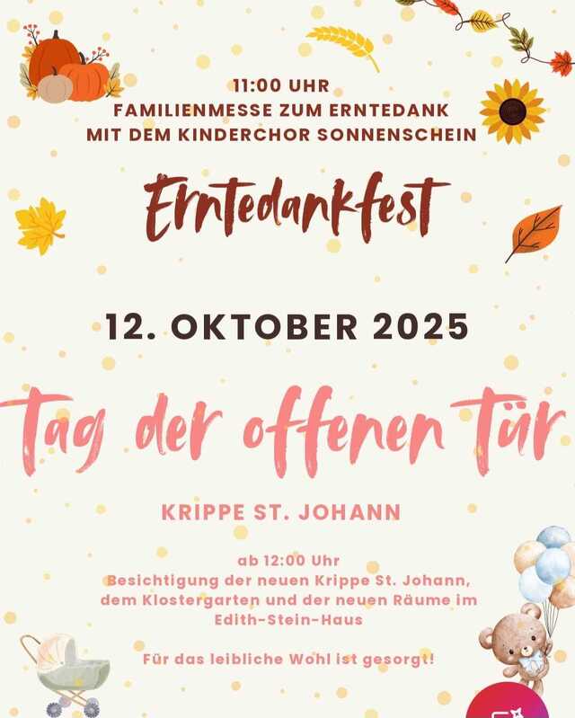 Am 12.10.2025 findet um 11:00 Uhr zum Erntedank eine Familienmesse mit musikalischer Unterstützung vom Kinderchor Sonnenschein in der Johanneskirche statt.