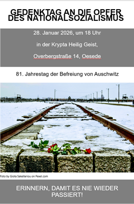 Am Mittwoch, 28. Januar 2026, feiern wir um 18:00 Uhr in der Krypta der Heilig Geist-Kirche einen als Andacht gestalteten Gedenkgottesdienst für die Opfer des Holocaust.