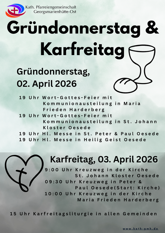 19:00 Uhr Gründonnerstag der Männer im Dekanat OS-Süd rund um Gesmold, Start an der Kirche St. Petrus ad vincula, Abschluss im Meditationsraum des Pfarrheims, Ende gegen 23:30 Uhr