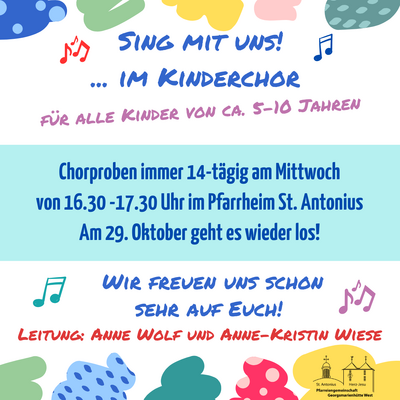 Alle Kinder zwischen 5 und 10 Jahren sind eingeladen, mit uns zu singen. Wir treten gelegentlich in den Familiengottesdiensten in der Antoniuskirche auf. Komm und sing mit uns!