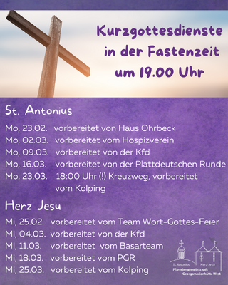 Herzliche Einladung zu Zeiten der Ruhe und Besinnung in der Fastenzeit. Die Kurzgottesdienste werden wieder von unterschieldichen Gruppen der Gemeinden vorbereitet und durchgeführt. Dauer 20-30 min.