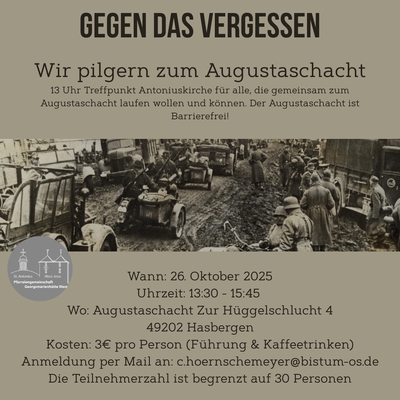 am 26. Oktober 2025 findet um 13:30 Uhr eine Führung am Augustaschacht statt. Die Teilnehmerzahl ist begrenzt. Anmeldungen werden per Mail unter c.hoernschemeyer@bistum-os.de entgegengenommen.