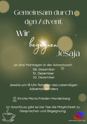 An jedem Abend begegnen wir Jesaja und seinen Texten. Im Anschluss gibt es die Möglichkeit bei Tee und Plätzchen zusammen zu sein und Anderen zu Begegnen.