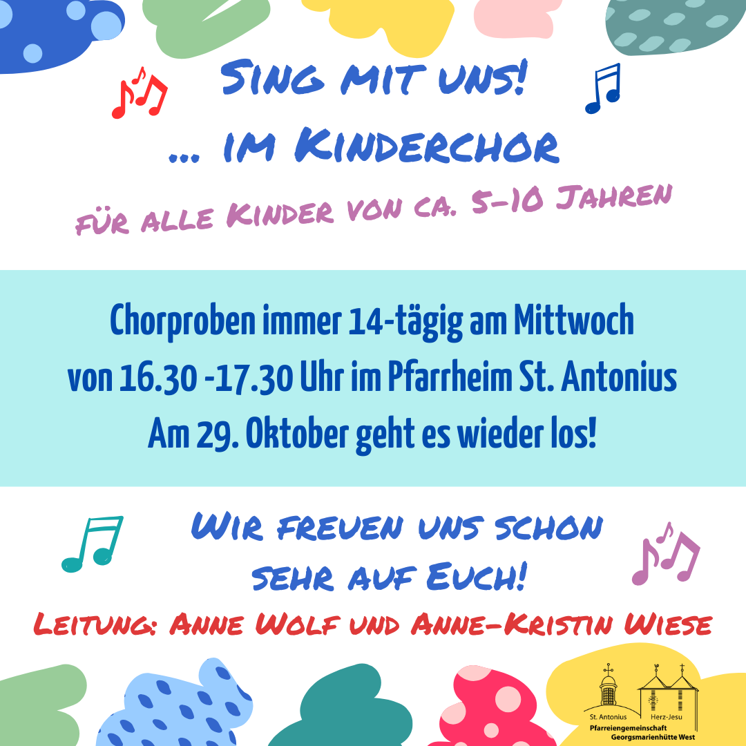 Alle Kinder zwischen 5 und 10 Jahren sind eingeladen, mit uns zu singen. Wir treten gelegentlich in den Familiengottesdiensten in der Antoniuskirche auf. Komm und sing mit uns!