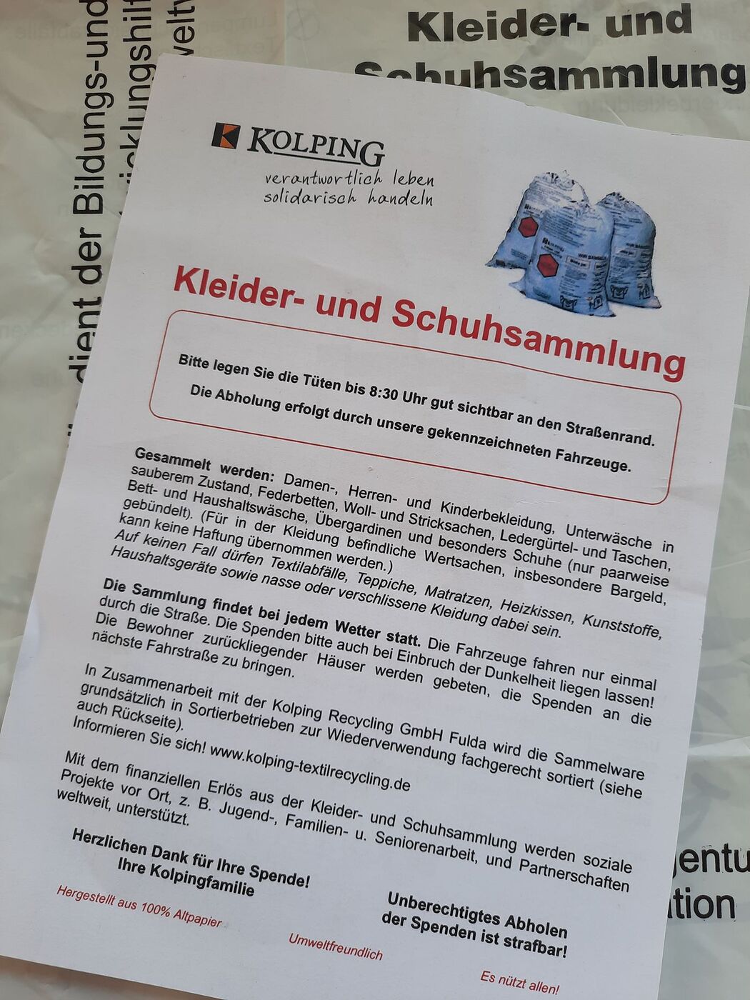 Kolpingsfamilien und achten Sie am Sammeltag darauf, dass nur mit "Kolping" gekennzeichnete Fahrzeuge berechtigt sind, die Kleiderspenden mitzunehmen.